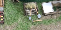 Stavebnice obsahuje 2 rýče, 2 krompáče a 2 lopaty